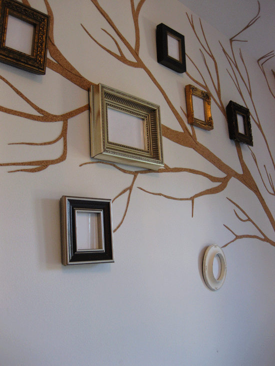 Nagy barkácsáruházakban lehet kapni ilyen öntapadós parafát. Ezt ollóval szbjuk fel a megfelelő csíkokra. Grafitceruzával előtte rejzoljuk fel a falra halványan a kontúrját. Végül jöhet a keretek felszögelése, majd a képek berakása.