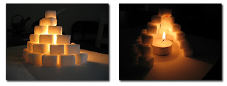 Hangulatos mécsestartót varázsolhatunk kockacukorból is! Körbe helyezzük a kockákat kis réseket hagyjunk köztük, alá tehetünk befőttesüveg tetejét, vagy kartonlapot. Ragaszthatjuk cukormázzal (kevés vízzel felfőzött cukor esetleg pár csepp citromlével), vagy ragasztóval is, hiszen valószínűleg már úgy sem fogjuk felhasználni a cukrot! A következő sort téglarakás szerűen rakjuk fel. Néhány sor után kész is! Nem ajánlatos a tetejét lezárni cukorral, de felügyelet nélkül se hagyjuk a lángoló mécsest! A készítése remek szórakozás gyerekekkel is, valamint építkezhetünk mást is a kockákból! C: Gyér fény mellett a mécses pedig melegséges hangulatot áraszt! |